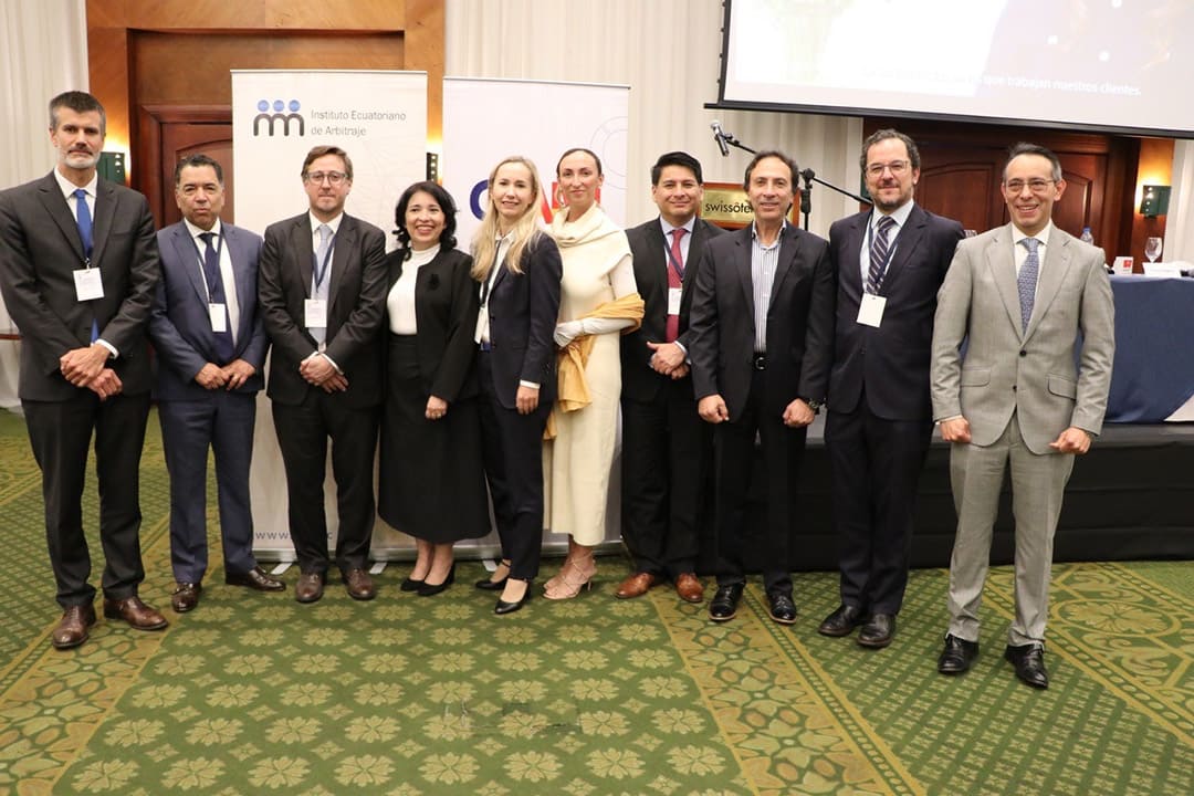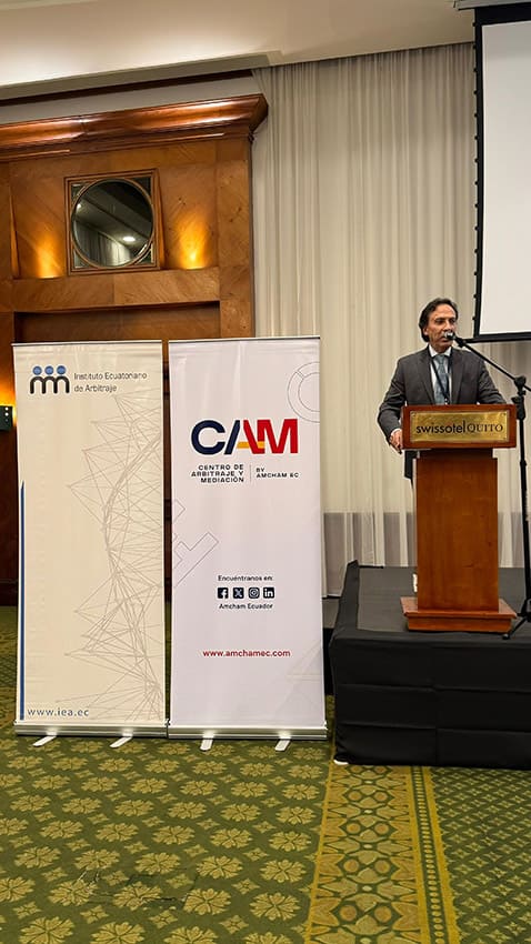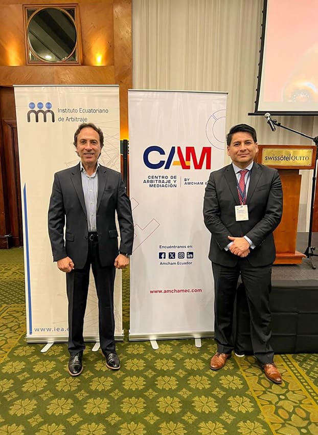Diego Romero Ponce- Presidente del Directorio del Centro de Arbitraje y Mediación de la Cámara de Comercio Ecuatoriano Americana-AMCHAM durante la XV Conferencia Internacional de Arbitraje organizada en Quito- Ecuador con el Presidente de la Corte de Arbitraje de AMCHAM-Perú- Roger Rubio, quién intervino como expositor- y otros expositores del evento- Octubre 2024.